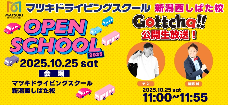 10/25(土)マツキドライビングスクール新潟西しばた校オープンスクール開催! Gottcha!!(昼)を出張生放送します!出演はヤン&モトキ!