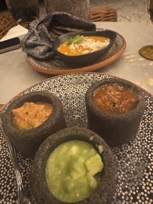 これに、ワカモレ、サルサソース。いろんなサルサソースが出てくるので、これが楽しみ。ただし、たまに辛すぎるものがあるので、水をかぶ飲みすることも!