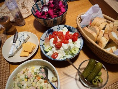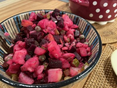 茹でたビーツと、ジャガイモ・にんじん・きゅうりのピクルスにお酢をちょっと和えて混ぜるだけ!