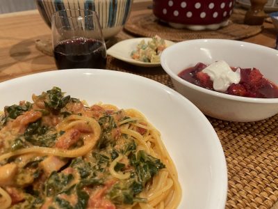 ベーコンとトマトクリームのパスタ、美味しいです。