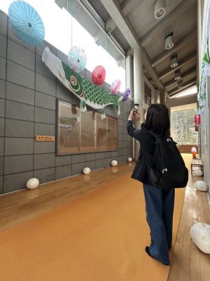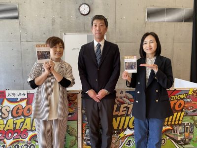 美人の湯スタッフの三野さん、創建1300年を迎えた青海神社の古川さん、