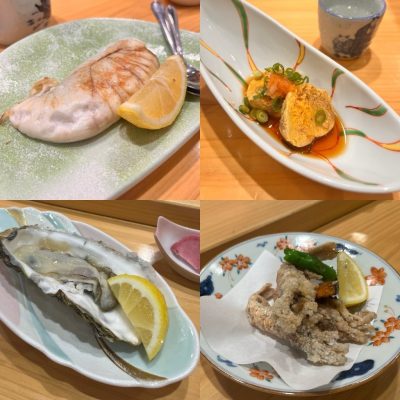 ふぐの白子焼、あん肝、牡蠣、エビのから揚げ・・・