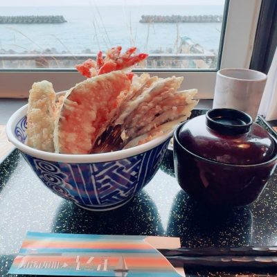 私はホタテ刺しと天丼!