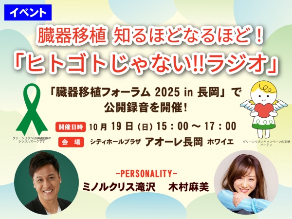 10/19(日)アオーレ長岡で臓器移植フォーラム2025 in 長岡 臓器移植 知るほどなるほど!『ヒトゴトじゃない‼ラジオ』公開録音開催!