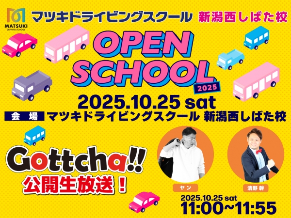 10/25(土)マツキドライビングスクール新潟西しばた校オープンスクール開催! Gottcha!!(昼)を出張生放送します!出演はヤン&モトキ!
