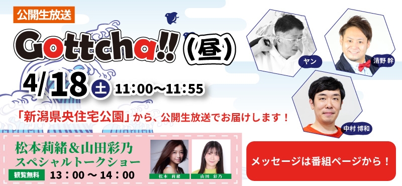 4/18(土)新潟県央住宅公園で、午前11時から「Gottcha!!(昼)」公開生放送!&午後は、スペシャルトークショー開催!!