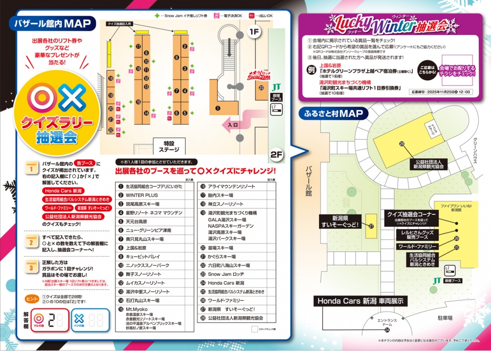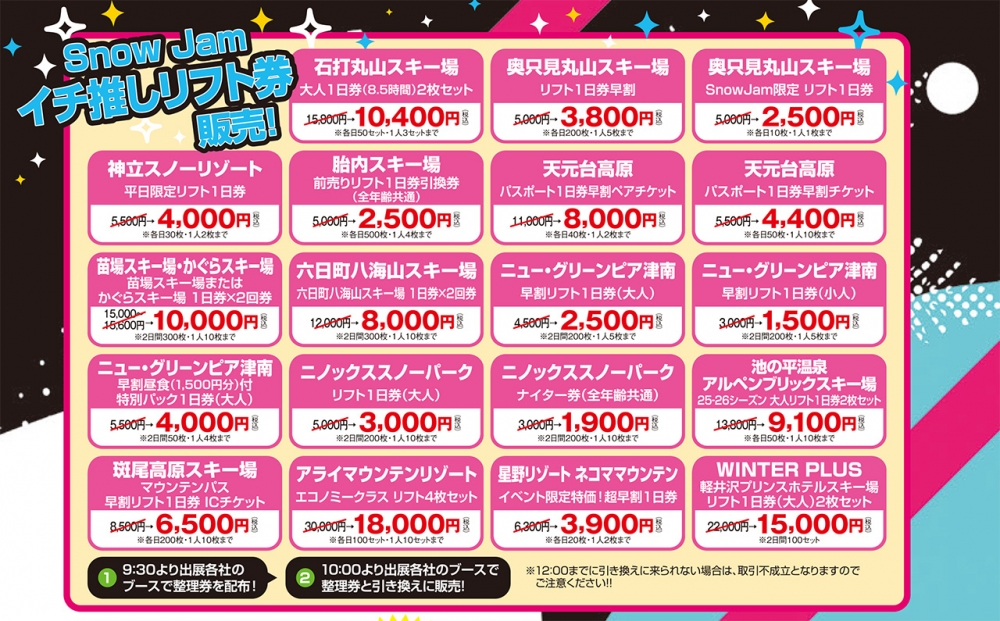 1)SnowJam会場で、9:30より、出展スキー場の各ブースで整理券を配布します。