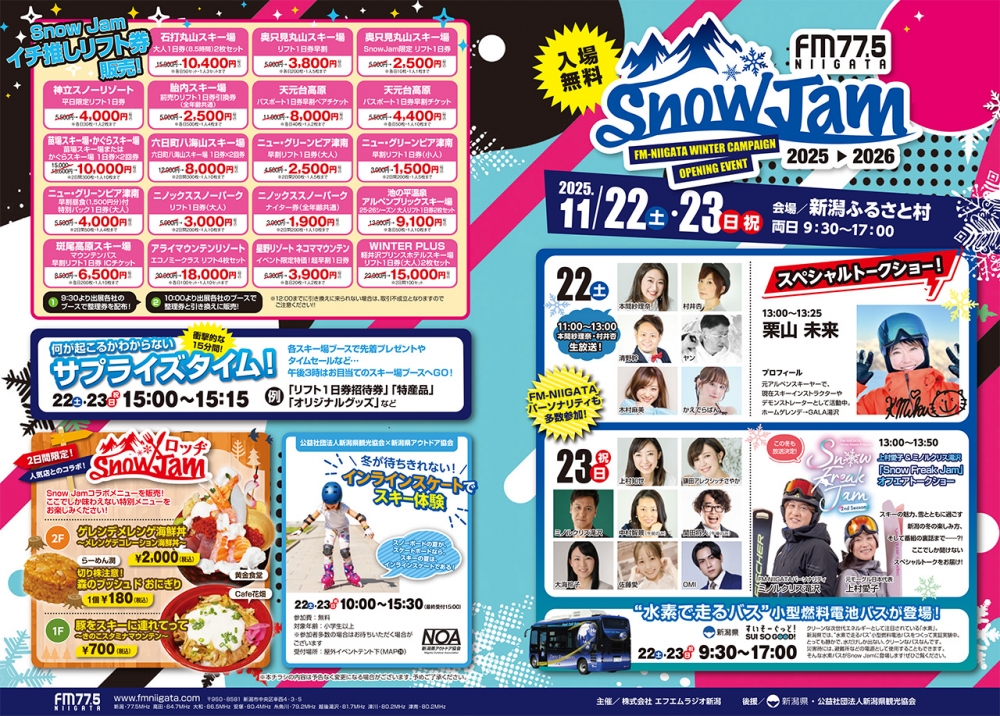 今年は、Snow Jamコラボメニューを、バザール館1階「Cafe花畑」(Snow Jam ロッヂ本店)、2階「黄金食堂」、「らーめん潤 新潟ふるさと村店」で販売!