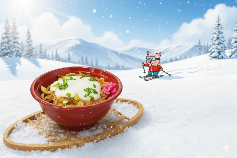 | 内容 | 県産きのこと、豚バラスライスの秋の彩りきのこ丼。県産のまいたけ・しめじ、県産豚バラをじっくり煮込みました。最後にとろろをトッピングして、雪山コースを駆け抜けるような力強い1杯です。 |