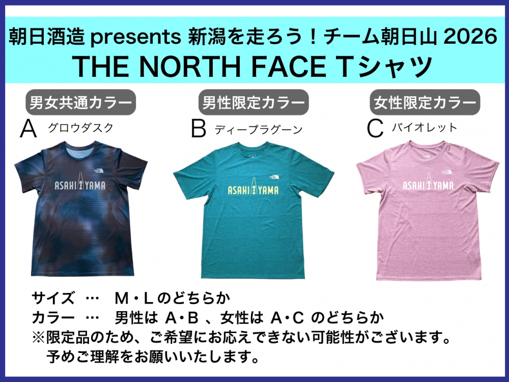 | 参加費 | 16,000円(税込) 【参加費に含まれるもの】 ・新潟シティマラソン2026参加権利 ・チーム朝日山2026 Tシャツ(THE NORTH FACE) ・ランニングイベント参加費・イベント保険・事務手数料 ※参加費のお支払い方法については、当選者にのみご案内いたします。 指定期限までにお支払いが確認できない場合、当選は無効となります。 ※パーティ参加費は別途料金となります。都度ご案内をさせていただきます。 |