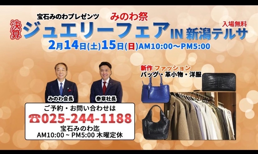 宝石みのわプレゼンツ 決算ジュエリーフェア㏌新潟テルサを開催します。
