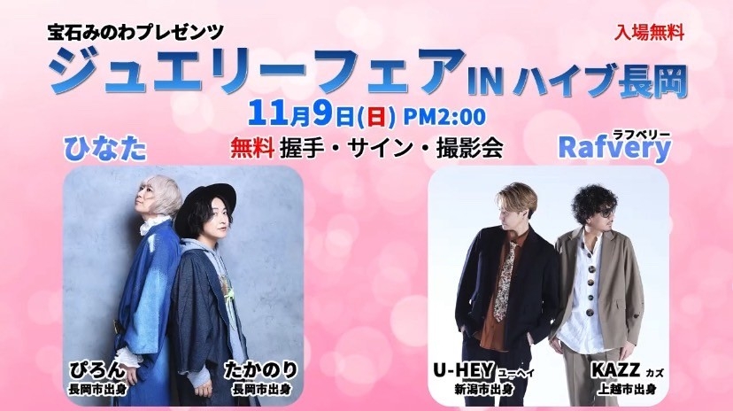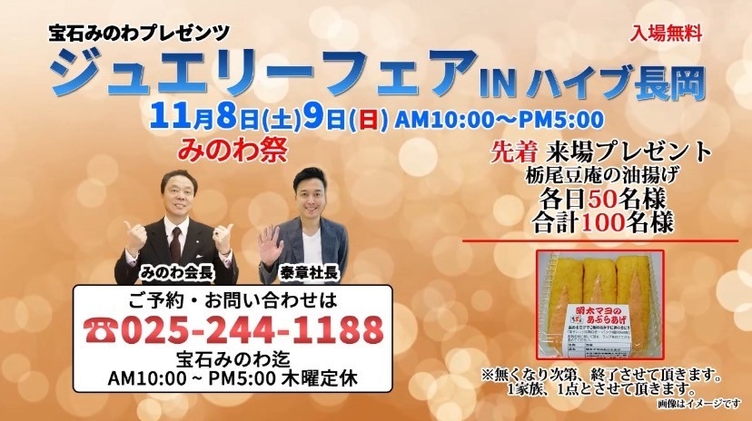 11月9日(日)は、ハイブ長岡で開催する「宝石みのわジュエリーフェア」に出演!