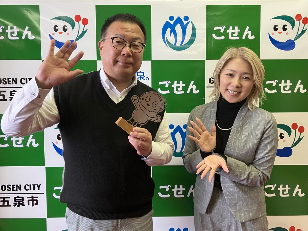 五泉市の田邊正幸市長と五泉市観光大使の斉藤瞳が、